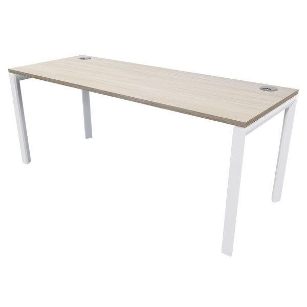 The Novah Workstation is a sleek and modern commercial office desk with a stylish white powder-coated steel frame base supported by levelling feet. It features convenient cable management ports and a 25mm Melamine top with a rigid matching PVC trim for a polished look.