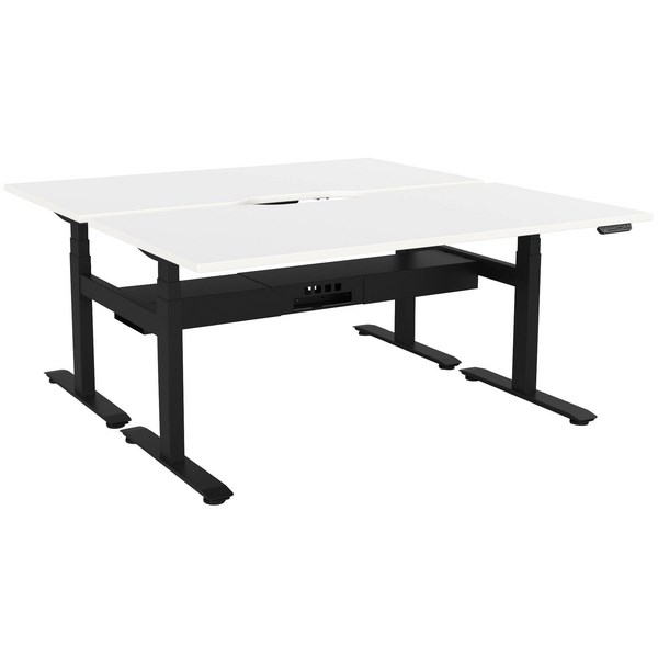 • Double sided electric height adjustable desk pod with White scallop tops and a Black frame