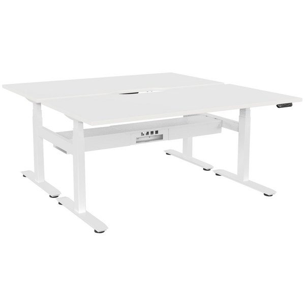 • Double sided electric height adjustable desk pod with White scallop tops and a White frame