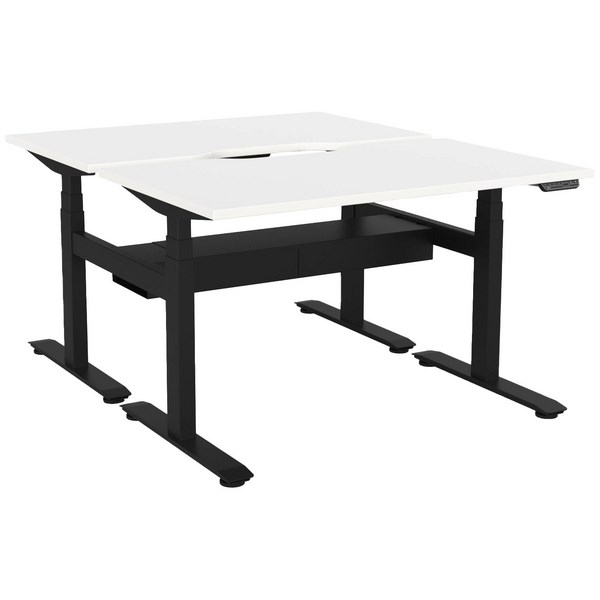 • Double sided electric height adjustable desk pod with White scallop tops and a Black frame