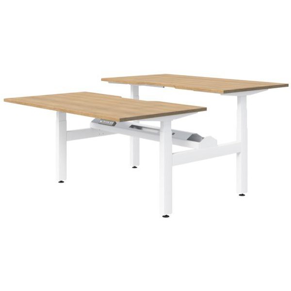 •Back to back electric desks with a Classic Oak Melteca top and a White powder-coated frame