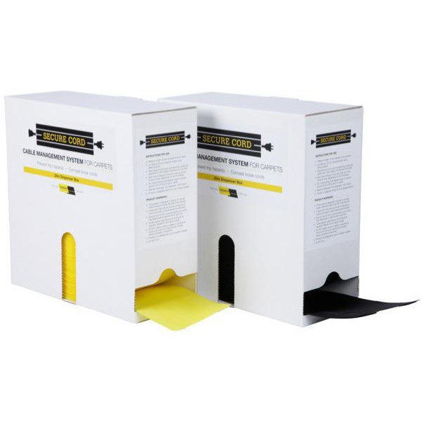 Secure Cord Cable Covers are ideal for securing loose cables to carpet surfaces. They help to reduce tripping hazards and are quick and easy to use. The clever design is low profile and is a great option for tidying up unsightly cords. Its flexible design allows it to be cut to any length, making it suitable for small and large applications. This reusable 100mm strip can hold up to 4 cords securely and is supplied in a handy dispenser carton.
