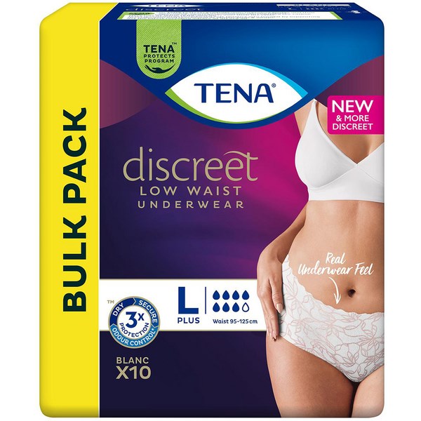 TENA Discreet Plus Low Waist Blanc Pants for women provides protection against moderate to heavy bladder weakness. These pants are body contoured full briefs, made to give a real underwear look so you can still feel stylish and feminine without compromising on protection.