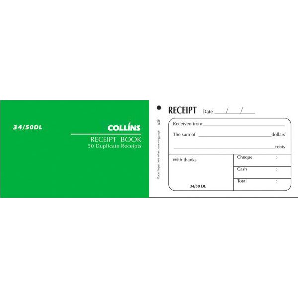 This Collins 34/50DL NCR Duplicate Receipt Book is a cash receipt book with carbon paper from Collins. The duplicate receipt book enables you to give one copy to your customer and to keep one for your records. The receipt book has space for six figure numbering.