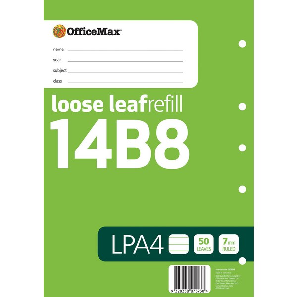 OfficeMax LPA4 /14B8 Loose Leaf Refill Writing Pads are especially created for schools by OfficeMax. With 50 leaves (100 pages), there are enough pages to keep you going through the school year. The lined pad has 7mm rulings and are ideal for practice essays and notes and measures 297x210mm(A4).