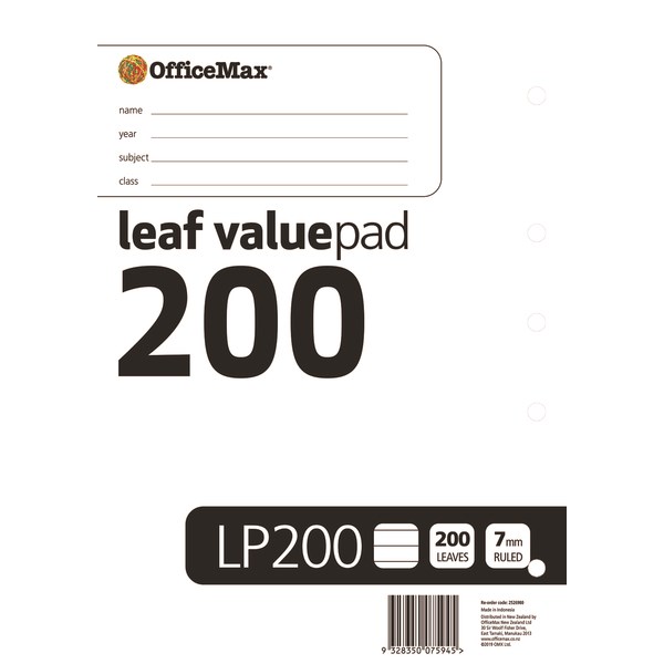OfficeMax Loose Leaf Value Pad is especially created for schools by OfficeMax. With 200 leaves (400 pages), there are enough pages to keep you going through the school year. The lined pad has 7mm rulings and is ideal for practice essays and notes. The refill pad measures 297x210mm(A4). This loose leaf value refill pad is ideal for schools and offices.