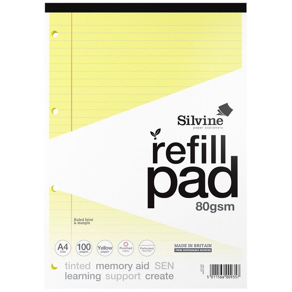 This Silvine A4 Tinted Refill Pad is a great study and learning aid for students. The refill has yellow tinted pages to help assist memory aid and SEN supportive learning. It has premium 80gsm paper with 8mm ruled lines with a margin on the left hand side.