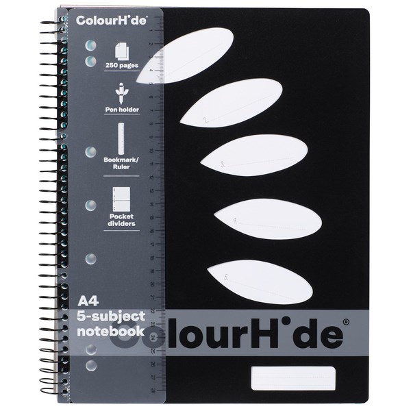 The ColourHide A4 Spiral 5 Subject 250 Page Notebook is ideal for note taking and keeping you organised at work, school or home. It has 250 ruled pages which are perforated so you can easily tear them out and the notebook also features a handy pen loop and detachable ruler. There are 5 subject sections and subject name cut outs on the front cover, so you can easily refer back to notes.