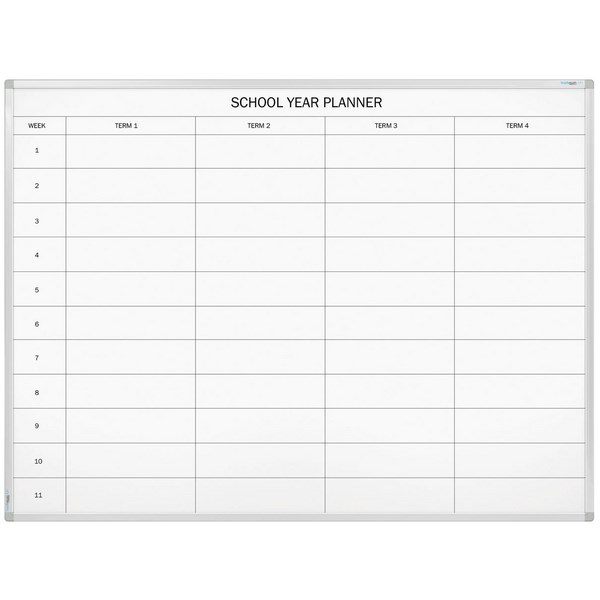 The Boyd porcelain school year planner has 11 weeks and 4 terms permanently gridded on. This makes it easy to use throughout the year and means you can simply erase the board and use it for the new term. The porcelain surface also has a magnetic surface allowing you to stick magnetic erasers or markers. It includes a walling hanging kit and has an annodised aluminium frame.