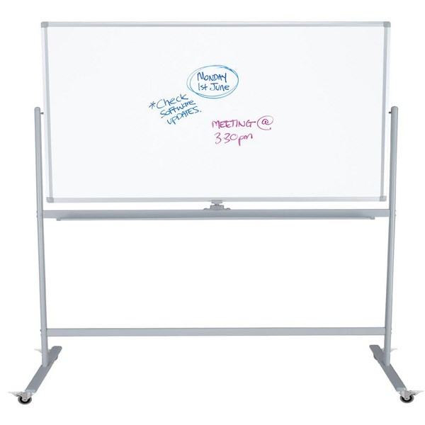 The Boyd Pivoting Mobile Whiteboard has a acrylic surface with magnetic capabilities ideal for presentations and meetings. It pivots 360 degrees and is double sided with a dark grey frame and pen shelf made from aluminium. The board frame is on 50mm castors can be locked into place easy of moving and stability. The base of the board has wheels for easy transportation and board angle can be adjusted.