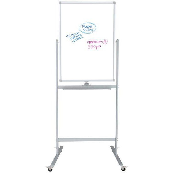 The Boyd Pivoting Mobile Whiteboard has an acrylic surface with magnetic capabilities ideal for presentations and meetings. It pivots 360 degrees and is double sided with a dark grey frame and pen shelf made from aluminium. The board frame is on 50mm castors can be locked into place easy of moving and stability. The base of the board has wheels for easy transportation and board angle can be adjusted.