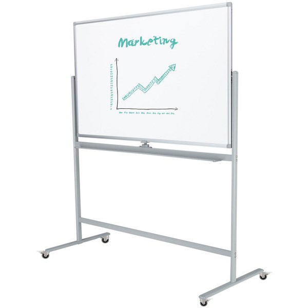 The Boyd Pivoting Mobile Whiteboard has a porcelain surface with magnetic capabilities ideal for presentations and meetings. It pivots 360 degrees and is double sided with a dark grey frame and pen shelf made from aluminium. The board frame is on 50mm castors can be locked into place for stability. The base of the board has wheels for easy transportation and board angle can be adjusted.