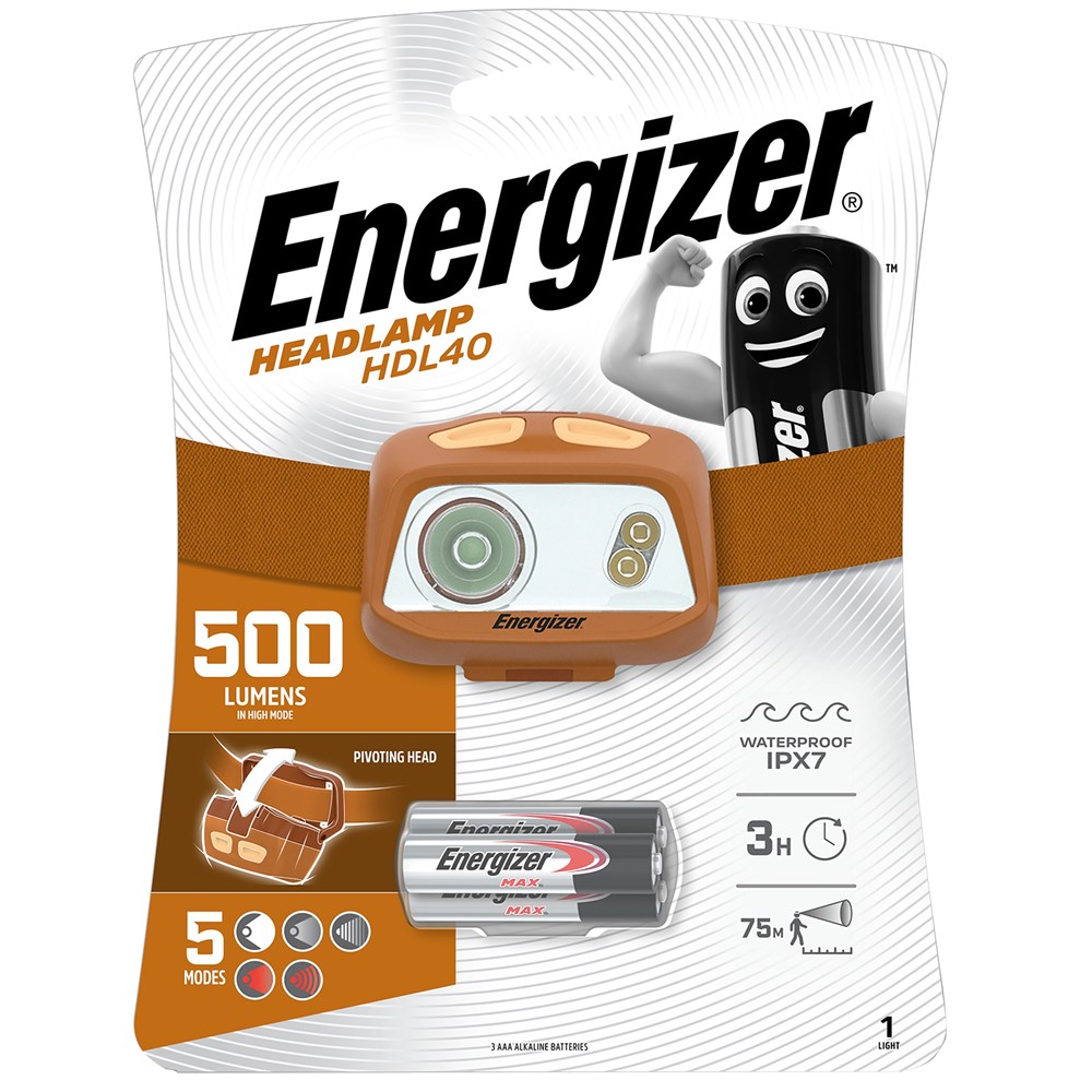 This Energizer Headlamp HDL40 features 500 Lumens of bright, durable and energy efficient LED light. It has a comfortable, adjustable head strap, anti-glare design, and pivoting head to direct light exactly as needed.