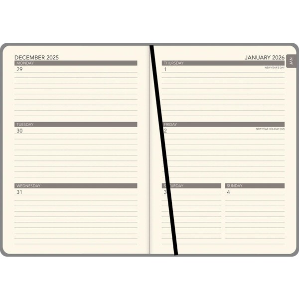 This Collins A53 Executive Diary has a week to view layout to help you to stay organised and on top of your busy schedule. This layout is great for people who need to see and plan their entire week at a glance. There is plenty of space for writing notes and keeping track of appointments. The diary has two ribbon markers so you can easily find your place, an elastic closure to keep your diary and its contents secure and a pen loop.