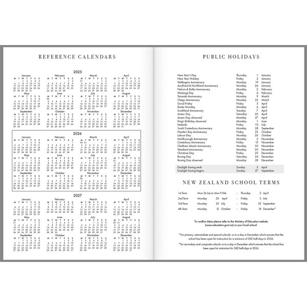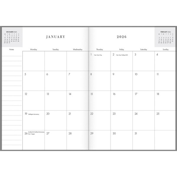 This Collins B5 Executive Monthly Planner is a great tool for tracking and planning your important events. The convenient month to view layout allows you to see the entire month at a glance, making it ideal for those who need to plan in advance and get a quick overview of their appointments. Features New Zealand holidays and school terms as well as reference calendars for 2025, 2026 and 2027.