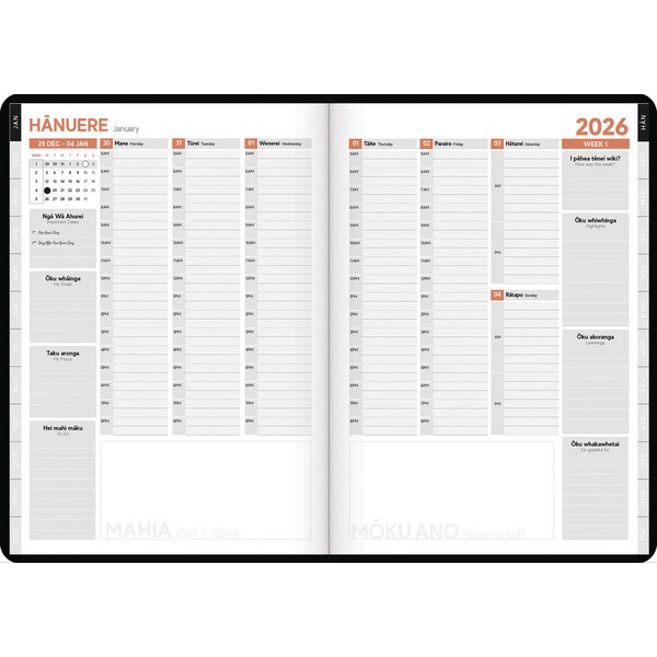 This Tuhi A43 Bilingual Diary has a week to view Mahere a wiki layout. This layout is ideal for those who need to have an at-a-glance view of their entire week and to make brief notes for appointments and meetings. The diary includes important Maori dates, public holidays and other significant dates, Karakia, Korero, Ko wai au and waiata to use as well as layouts for Matariki and Maramataka. There is also space for goal planning and weekly reflections.