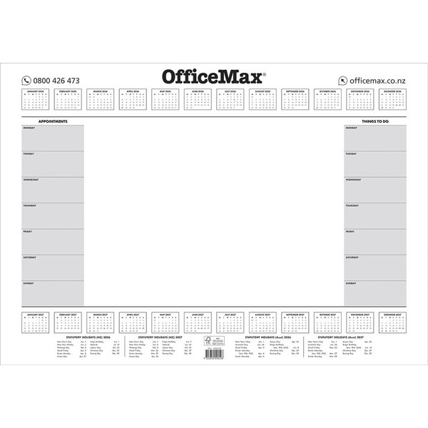 This OfficeMax Desk Pad Calendar is a weekly planner that is ideal for home and office use. It features handy 2026 and 2027 reference calendars per page for easy planning. It has space for appointments and a 'things to do' column, ensuring you are always organised and never forget important dates and tasks. Printed on 80gsm paper and gummed on 3 sides.