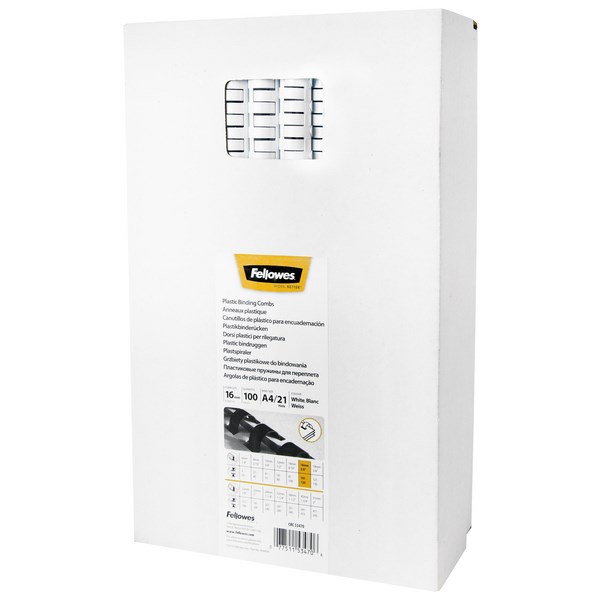 Use these Fellowes 16mm white plastic binding coils to bind your documents with a professional appearance. The coils are durable, premium quality and suitable for binding a variety of documents such as reports and manuals. These coils are suited for use with a 21 loop plastic comb binding machine. The 16mm size makes them perfect for binding documents between 101-120 pages.