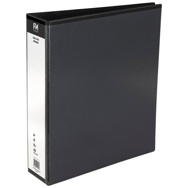 Constructed from 100% recycled board and recyclable polypropylene, the FM Overlay Ringbinder is a great option for keeping your work space at home, the office or school organised. This 2 D ring binder is black in colour and has a clear plastic overlay designed for inserting your own printed sheet, which allows you to customise the front cover and spine for easy identification