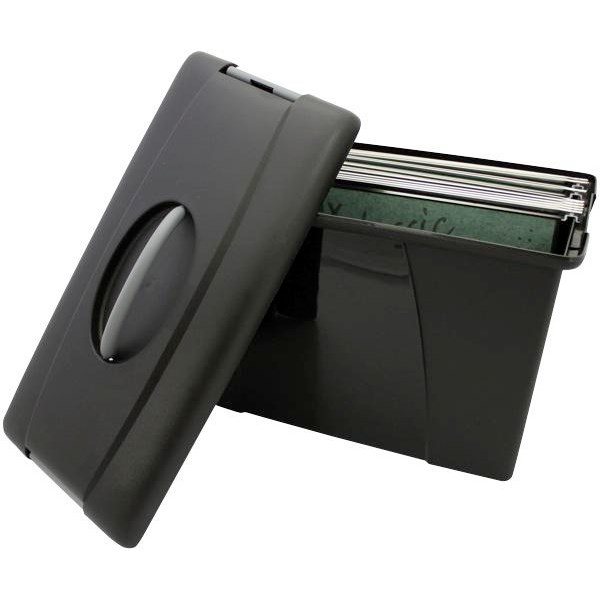 This Rexel Suspension File Storage Carry Case is a hard sided, plastic suspension file cabinet with a removable lid and carry handle. A convenient, easy way to store and transport files. Files not included.