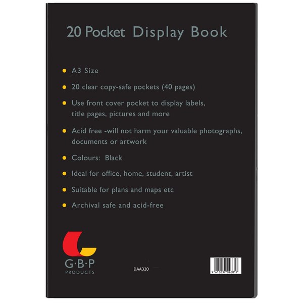 This GBP A3 Display Book is perfect for storing or art pieces or presentations. It has a capacity of 40 pages with its 20 clear plastic pockets which are securely bound into its cover to protect your work. The durable cover also has a pocket for inserts and customising.