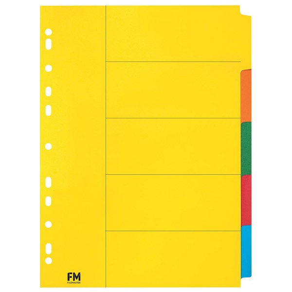 Ideal for rapid indexing of your files, the FM Index Dividers are made of cardboard and are ideal for colour coding your work or keeping paperwork organised. The cardboard dividers include 5 tabs in different colours and can be typed on directly.