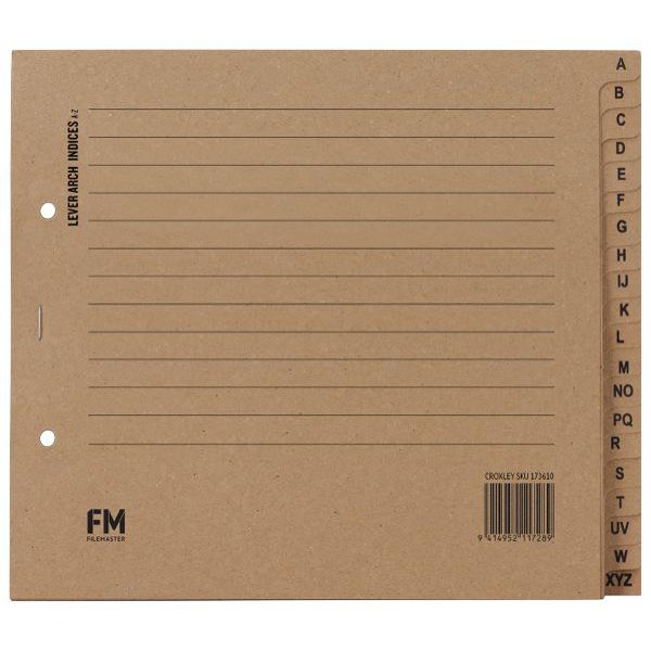 These FM A-Z Index Dividers are two hole punched and are designed to fit into all lever arch files and standard two hole ring binders. Each divider has a tab for a different letter(s) of the alphabet and the front tab has a handy contents page to help with organisation.