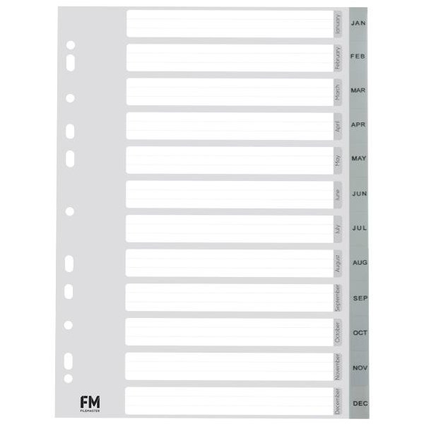 Get organised with these grey A4 FM Index Dividers 12 Tab Jan-Dec dividers made from strong, durable polypropylene which is waterproof and can be easily wiped clean. The set has 12 printed Jan-Dec tabs to help you organise your important documents such as invoices into monthly sections, and it also includes a white table of contents so you can organise all your tabs and access them with ease. They will not tear or break with consistent use and are excellent for folders, files and binders that are used regularly. Ideal for use in the home, office or at school.