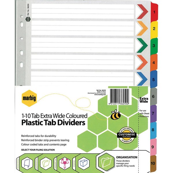 Marbig Plastic Tab Coloured Dividers feature reinforced tabs for durability and reinforced binder strips for longer life. Colour coded contents page and tabs for easier indexing. All tabs are printed, except 5 and 10 Tab. Extra Wide Dividers are 240mm wide and are designed for use with sheet protectors as the tabs extend beyond the edge of the pocket. Each divider is reinforced A4 board. 1-10 tabs.