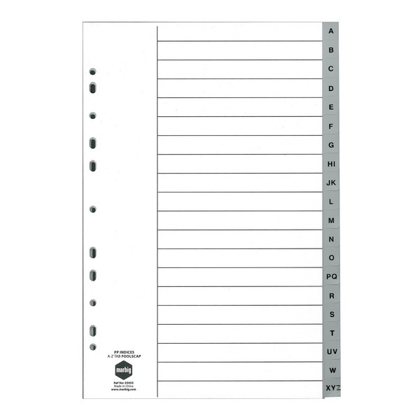Marbig A-Z Polypropylene Indices are made from lightweight yet strong plastic that will not tear or break. All the indices are multi-punched to fit two, three and four-hole ringbinders.