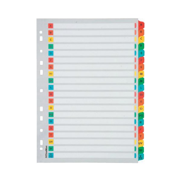 Office Max A-Z reinforced cardboard index tabs are ideal for organising projects and work. Quality cardboard indices with brightly coloured tabs and reinforced plastic designed for heavy duty use. Reinforced multi-punched holes designed to fit 2, 3 and 4 hole ring binders. Separate colour coded contents page for easy referencing.