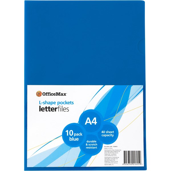 OfficeMax L-Shaped Pockets are ideal for preserving important documents or carrying documents while you're on the go. They are also ideal for presenting short reports and quotes. The L-shaped pockets open top and side, with cut-back thumb holes, for easy access to most used documents. The base seal is folded for extra strength ensuring document to not fall out from the bottom. Made from polypropylene, it is durable and scratch resistant.