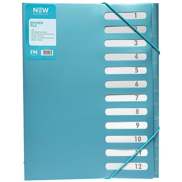 The New Generation FM A4 Tabbed File Divider is a versatile and practical solution for organising documents. It features 12 tabbed pockets, each with a writeable label, making it easy to categorise files. The file divider holds up to 200 sheets of 80gsm paper and has an elastic closure designed for durability and ease of use. The ocean blue colour adds a touch of style to your office setup.