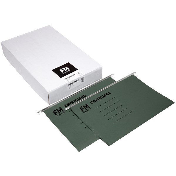 FM Crystalfile Suspension Files have heavy duty suspension for use in vertical filing cabinets and drop front files. The nylon runners enable smooth, quiet gliding of suspension files along metal bars and have a labelling panel for easy file identification. They are pre-punched for use with Crystalfile File Fasteners and hold up to 150 sheets of paper. Manufactured from thick 220gsm board for strength and durability, they are the perfect option for your office. Comes complete with top tabs and white insert title strips.