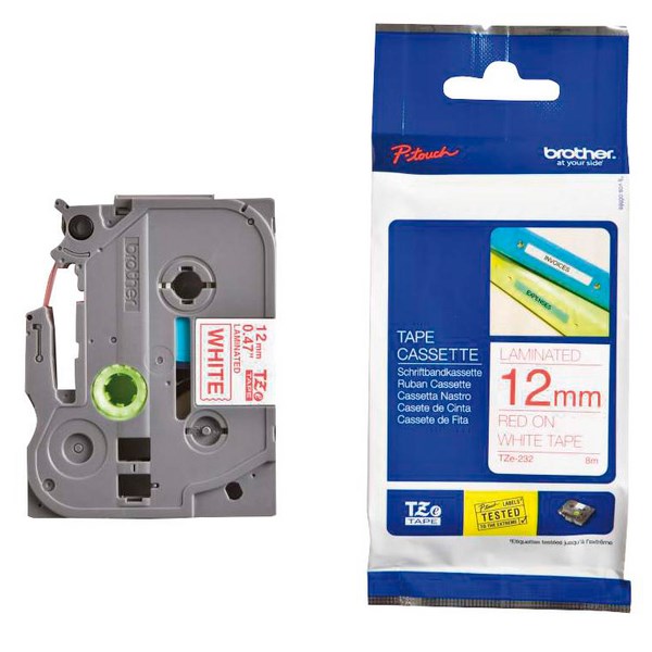 Brother TZe-232 label tape is perfect for organising files, equipment, lunchboxes, storage containers, cables, switches, and more. It is durable, resistant to fading, hot and cold temperatures, and chemicals. It has a professional finish and prints red text on a white label. Compatible with Brother P-Touch label printers, the TZe-232 tape is easy to read and handy for use at home, office or workplace.