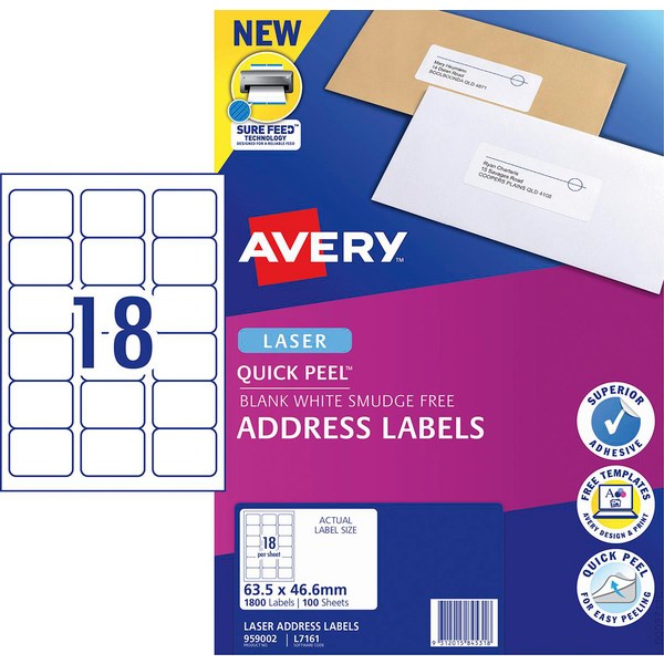Avery Quick Peel Laser Address Labels are excellent for letters, mail-outs and invitations. The permanent adhesive backed labels feature Quick Peel technology which enables easy removal of labels from the backing sheet. Labels are designed with Sure Feed technology for reliable feeding and printing through laser printers, minimising wastage and saving time. To create labels, use the free Avery Design and Print template software. Label adhesive can withstand the high heat from laser printers.
