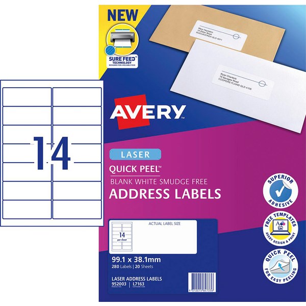 These Avery Quick Peel Laser Address Labels are excellent for letters, mail-outs and invitations. The permanent adhesive backed labels feature Quick Peel technology which enables easy removal of labels from the backing sheet. To create and customise convenient, professional labels simply download and use the free Avery Design and Print template software. Labels are designed with Sure Feed technology for reliable feeding and printing through laser printers, minimising wastage and saving time. Label adhesive can withstand the high heat from laser printers.