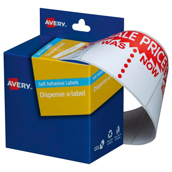 These Avery Dispenser Labels with 'Sale Was/Now' printed on them are ideal for identifying items on sale and price reductions. The red and white labels have removable adhesive, allowing you to re-position and replace when needed. The Sale Was/Now labels come in a handy dispenser box which causes labels to pop up easily when pulled, ideal for repetitive or routine tasks. Labels measure 65x44mm.