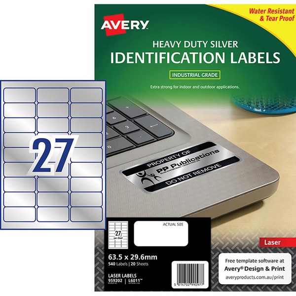 These Avery Heavy Duty Laser ID Labels are designed for asset tagging and identification, perfect for use on electronics, office equipment, tools, medical supplies and refrigerated samples and containers. The identification labels are tear-proof and resistant to oil, water, dirt and UV. Built to withstand temperatures from -20°C to +100°C, these durable labels are compatible with black and white laser printers for a clean, professional finish.