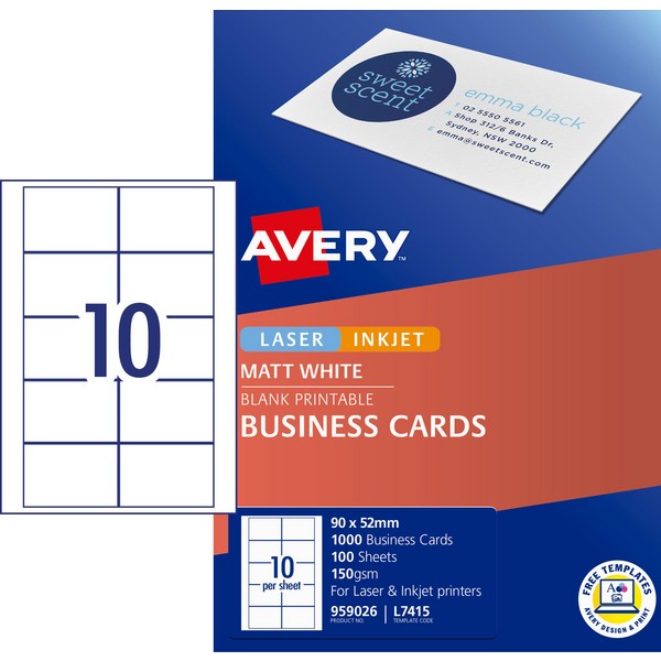 These Avery Laser and Inkjet Business Cards are a convenient way to print professional business cards. Avery Business Cards allow you to print the quantity you need, at the time you need for convenience and cost effectiveness. The white cards come in a sheet of 10 labels with micro-perforations between each business card for simple separation. To easily and conveniently design and create professional business cards download and use the free Avery Design and Print template software at work or at home.