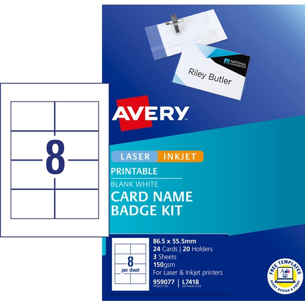 These Avery Name Card Badge Kit are a convenient way to print fresh, professional name tags at your next event or conference. Includes card inserts and PVC-free badge holders with two options for securing the badges clothing either by a clip or by a pin onto a lapel or shirt pocket. And once your event is over, the holders with the clip attachment can be reused time and time again. Download and use the free Avery Design and Print template software to easily create your convenient, professional labels.