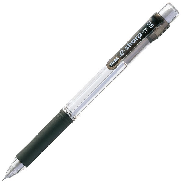 The Pentel E Sharp Mechanical Pencil offers a long rubber grip and lead maximiser. Transparent barrel with black. Contains 2 leads, the leads being 0.5mm wide.