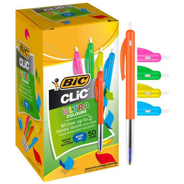 BIC Clic Blue Ballpoint Pens are affordable and retractable ballpoint pens. It features a handy pocket clip so you can have your pen at your finger tips. With just a push of a button put your ideas down to paper, ideal for an everyday pen. Tungsten carbide ball allows free flowing ink that is fast drying and ensures smooth writing. Comes in a box of 50 brightly multi-coloured pens with a medium 1.0mm tip and blue ink.