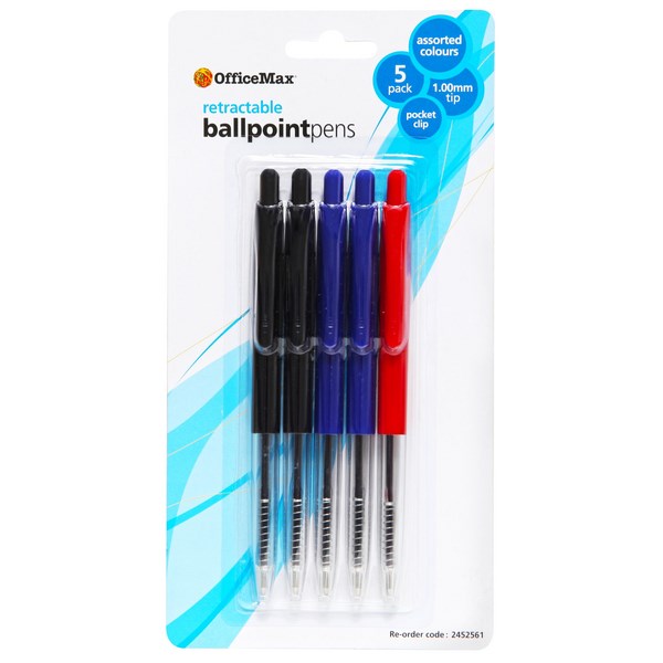 •A pack of 5 OfficeMax retractable ballpoint pens with red, blue and black ink