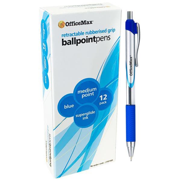 Blue OfficeMax Retractable Ballpoint Pens have 1.0mm tips and metal points. The rubberized grip makes for comfortable writing and the clear window in the barrel allows you to keep an eye on the ink level. The barrel has a metal pocket clip and the accents are colour co-ordinated to the ink colour for easy identification.