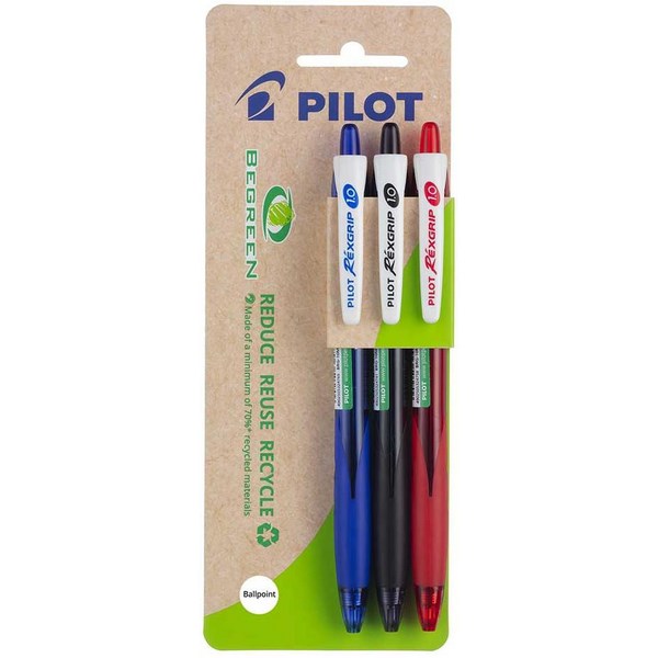 The Pilot Rexgrip BeGreen pen is a reliable, retractable ballpoint pen with a trendy barrel design. It features an integrated rubber grip for added writing comfort and a handy pocket clip for convenience. It is made from 77%¹ recycled materials reclaimed from manufacturing and percentages are calculated excluding replaceable parts such as refills, cartridges and leads. The pen has a 1.0mm medium tip and is compatible with Pilot Super Grip RFNS-GG ballpoint refills. Comes in a pack of 3 ballpoint pens in assorted colours.
