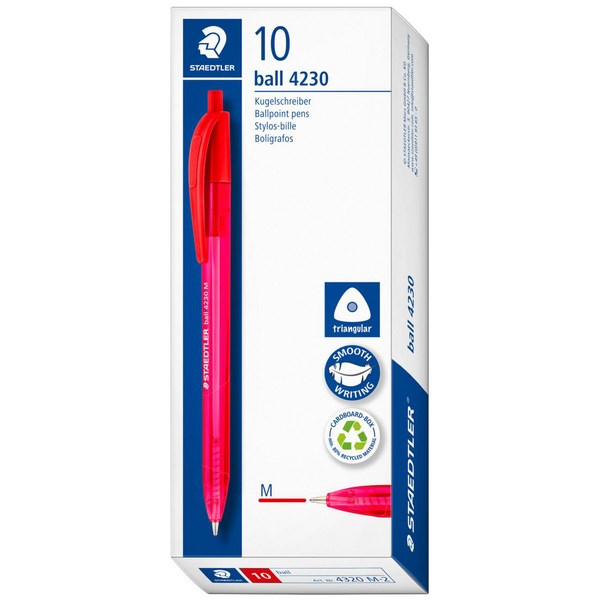 These Staedtler Triangular Ballpoint Pens are great to have on hand in the stationery cupboard, desk drawer or handbag. The pens have an ergonomic triangular shaped barrel and easy flowing ink for a smooth writing experience. They have a 1.0mm tip and write with a medium line width. The pens have red ink.