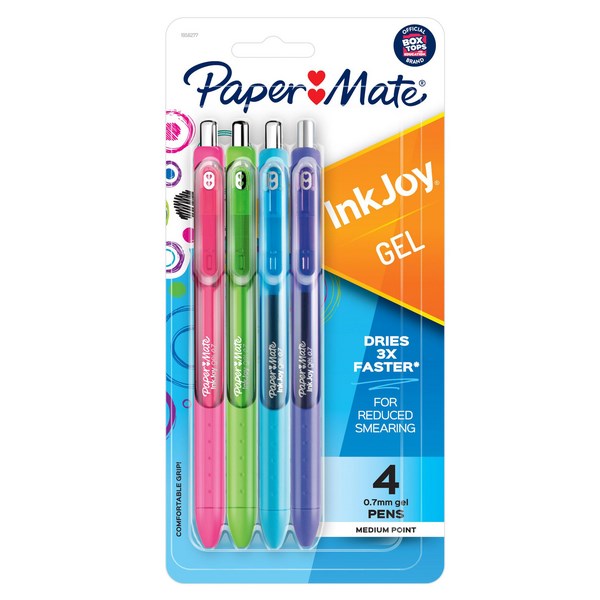 The Paper Mate InkJoy Fashion Assorted Gel Pens feature a pack of four 0.7mm pens in the colours pink, green, blue and purple. The vivid gel ink is fast drying for less smearing. The pens are fully wrapped with an ergonomic grip to ensure comfort when writing, and help to prevent fatigue after continuous use. The medium tip ensures writing is smooth and fluid, making these pens ideal for the workplace, home, or schools.