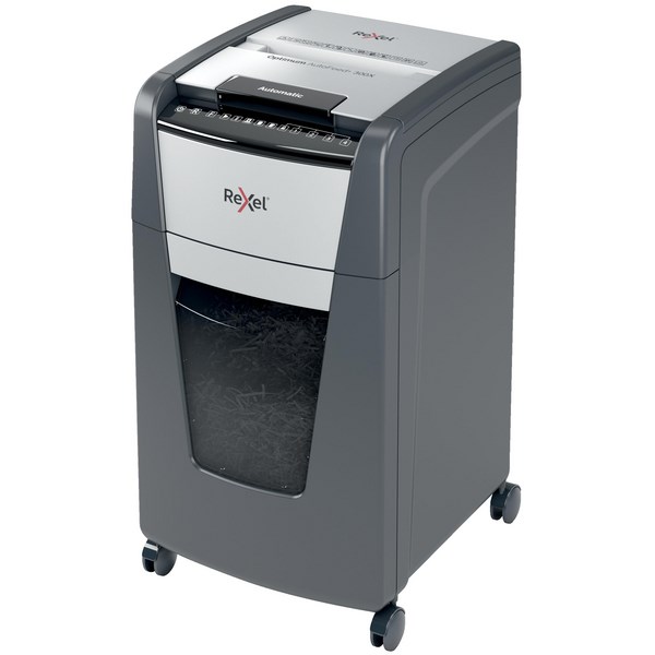 The Rexel 300X Optimum Autofeed Cross Cut Shredder is efficient and easy to use, saving you time and improving your productivity. Using the auto feeding mechanism, simply open the lid, fill with paper, and close, and shredding will begin automatically. It has a 4x28mm cross cut and is ideal for bulk shredding jobs in the office with an auto jam reverse feature to clear any paper jams and an induction motor for quiet running. The 60L capacity bin can be pulled out for easy emptying.
