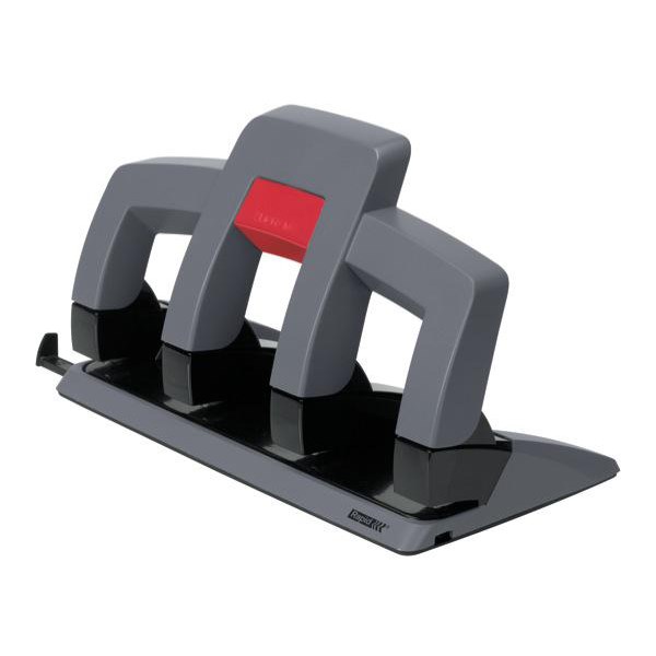 The Rapid Supreme SP34 is a power boosted 4-hole punch for up to 30 sheets capacity. The power of Press Less™ technology reduces the effort by over 50% compared to other hole punches. Features include an ergonomically shaped handle with a lock-down function for easy storage, adjustable paper guide and centre mark for fast accurate hole positioning, and solid construction for high performance and durability.